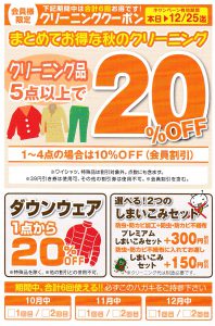 「少しでもお財布に優しく!」クリーニングハウスひまわりでは12月まで会員様限定で月2回の割引を開催しています。是非、この機会にお出しくださいね!