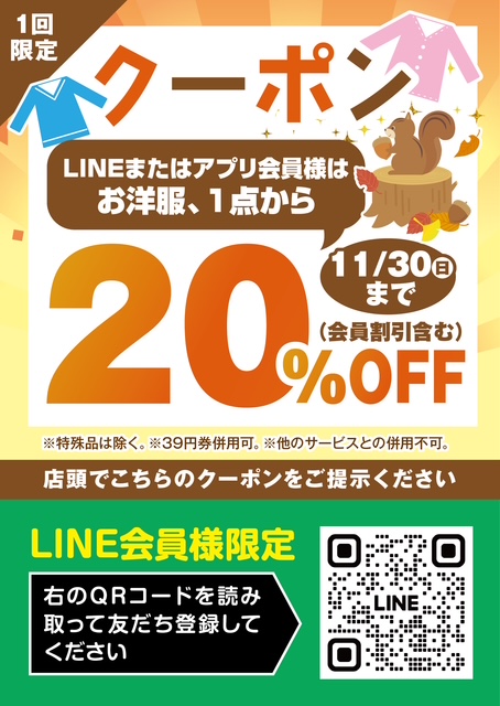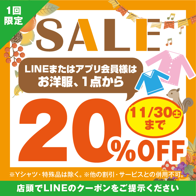 秋の衣替えクーポン配布中!LINE・アプリ会員様に配信しております。今から必要な... -