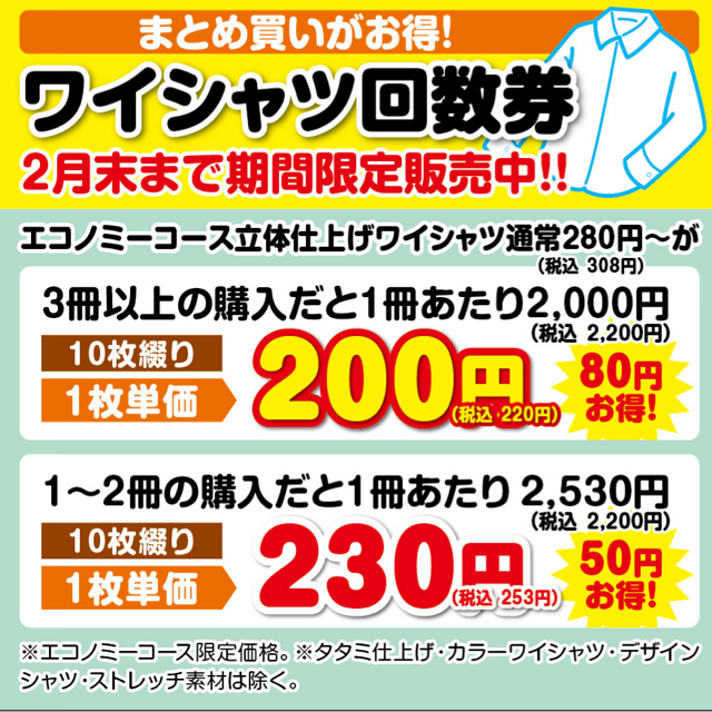 2月恒例のとってもお得なワイシャツ回数券を販売しています! 期間限定の販売です... -