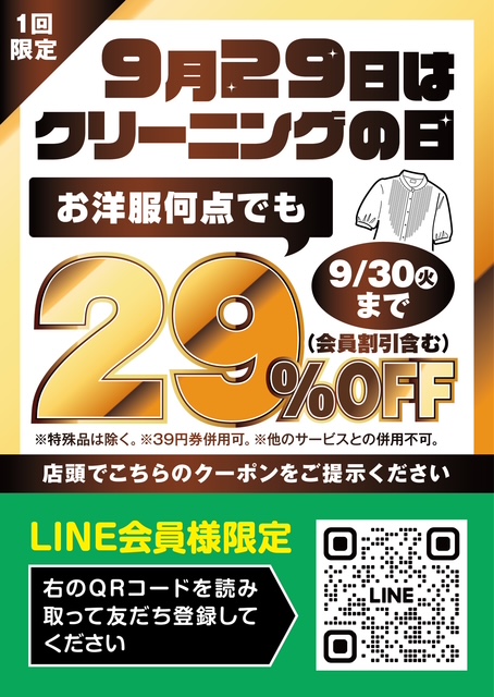 9月29日はクリーニングの日です!当店では9月26日~9月30日までクリーニング29%OF... -